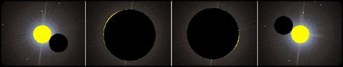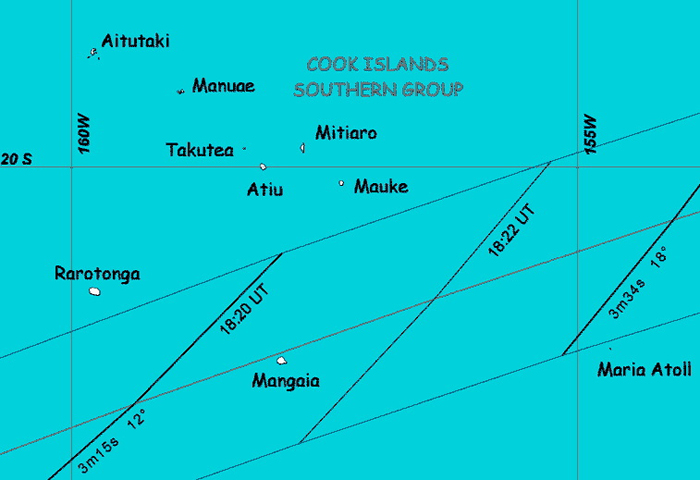 Mangaia was almost at the centre of that narrow track (map courtesy of Fred Espenak/Jay Andersoin, NASA/Goddard Space Flight Center). An eclipse also has its own lifecycle. This is how things looked and when on Mangaia during the four phases of contact. (Note that the photos of the phases - first to fourth contact - are not of the Mangaia eclipse but for illustrative purposes)