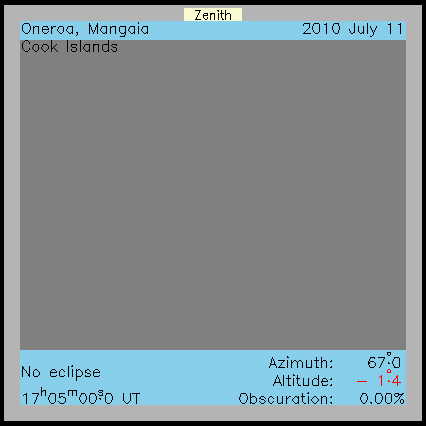 In the bottom left hand corner is the phase of the eclipse and the exact time GMT (also known as UT or universal time). Deduct 10 hours for the time on Mangaia. Bottom right is the azimuth - the compass direction in degrees where an object in the sky appears. The altitude is the angle in degrees above the level horizon. The two combined enable the positon to be pinpointed exactly. Obscuration is the percentage of the sun's disc that appears to be covered by the moon.