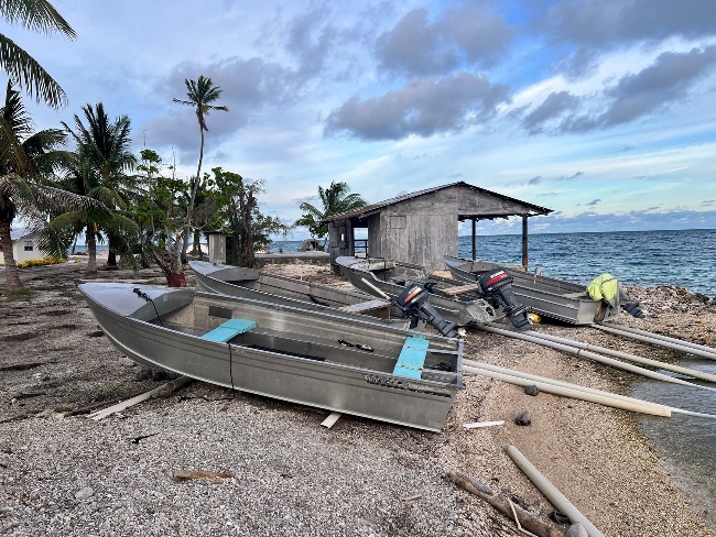 Almost every adult male has a boat. They're are almost exclusively aluminium dinghies (skiffs/tinnies) in the 14 to 16 foot range and powered by outboard motors of 15 to 40 horsepower. They sit on the beach and are taken in and out of the water by hand each day. Some are over 30 years old and when they crack they're repaired with aluminium from the remains of a an American B24 bomber which crashed on the island in World War II. (READ THE STORY ABOUT IT HERE). There are numerous different fishing techniques employing a range of traditional and modern equipment. Tom went out in a boat with Maru and experienced pole fishing, trolling, and spearing. Once in the lagoon, and after a prayer, the pole fishing began...