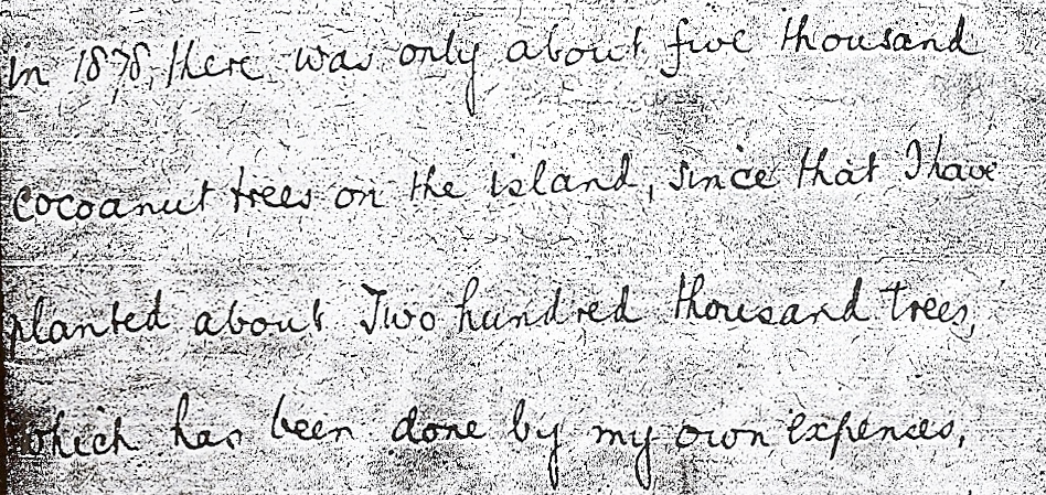 For now though, let's continue with William's letter. We learn next that he has been busy planting coconut ("cocoanut") trees - "about two hundred thousand" of them - paid for out of his own pocket