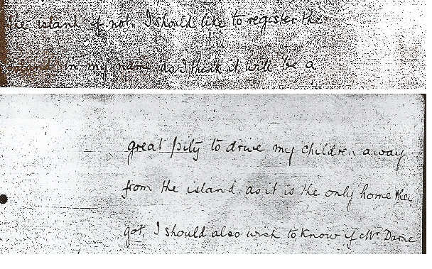 "I should like to register the island in my name as I think it will be a great pity to drive my children away from the island as it is the only home they got," And he goes on to ask if Mr Darsie can drive him away from Palmerston without compensating him for the improvements he has made over the past ten years.