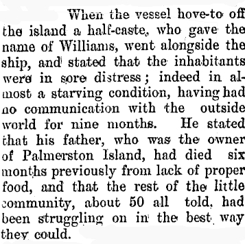 Sailors on the American barque, 'Empire' that called into the island on 7th February, 1900 were told by one of his sons that he died about six months earlier "from lack of proper food" and the remaining 50 inhabitants of Palmerston were starving. Captain Knacke provided them with some supplies and promised to report their desperate condition to the authorities on Rarotonga. And the story he told on his return to Australia was reported in the 'Thames Star' of New Zealand on 27 April, 1900. (The "he" referred to in the newspaper story is one of William's sons, but it isn't clear which as the report names him as "Williams")